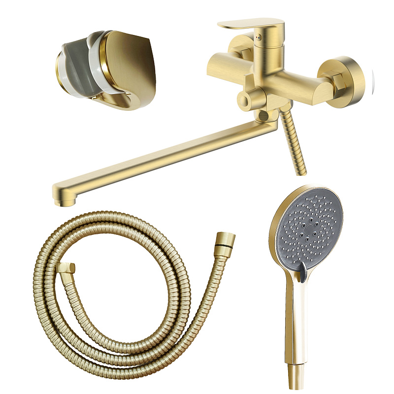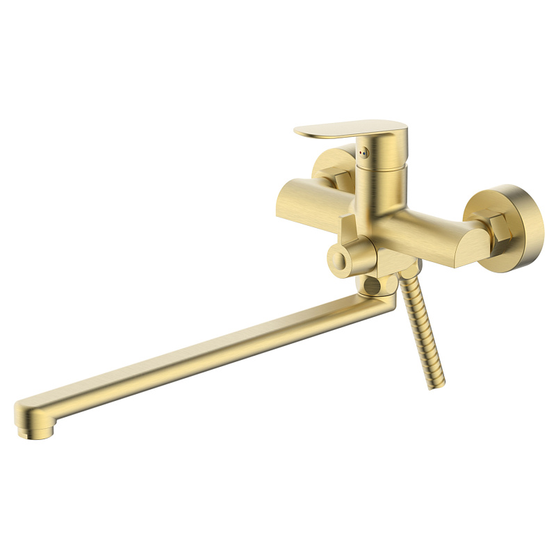 —Смеситель для ванны Azario Alanti керамический картридж, длинный излив, с ручным душем, шланг 150 см, золото матовое (AZ-K1732MG)