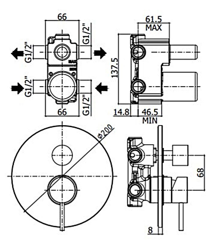 Смеситель встраиваемый для душа  на 2 выход с накладкой из металла диам.200мм, девиатор-картридж, 2 положения+1 комбо, Черный матовый