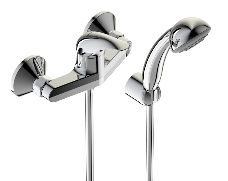 ORION Настенный смеситель для душа, монтаж на стандартных эксцентриках (в комплекте: эксцентрики, металлические отражатели, уплотнительные прокладки), керамический картридж 35 мм, металлическая рукоятка с индикаторами горячей / холодной воды, душевой гарнитур в комплекте (душевая лейка Ø70 мм, металлический шланг 1500 мм, держатель для лейки)