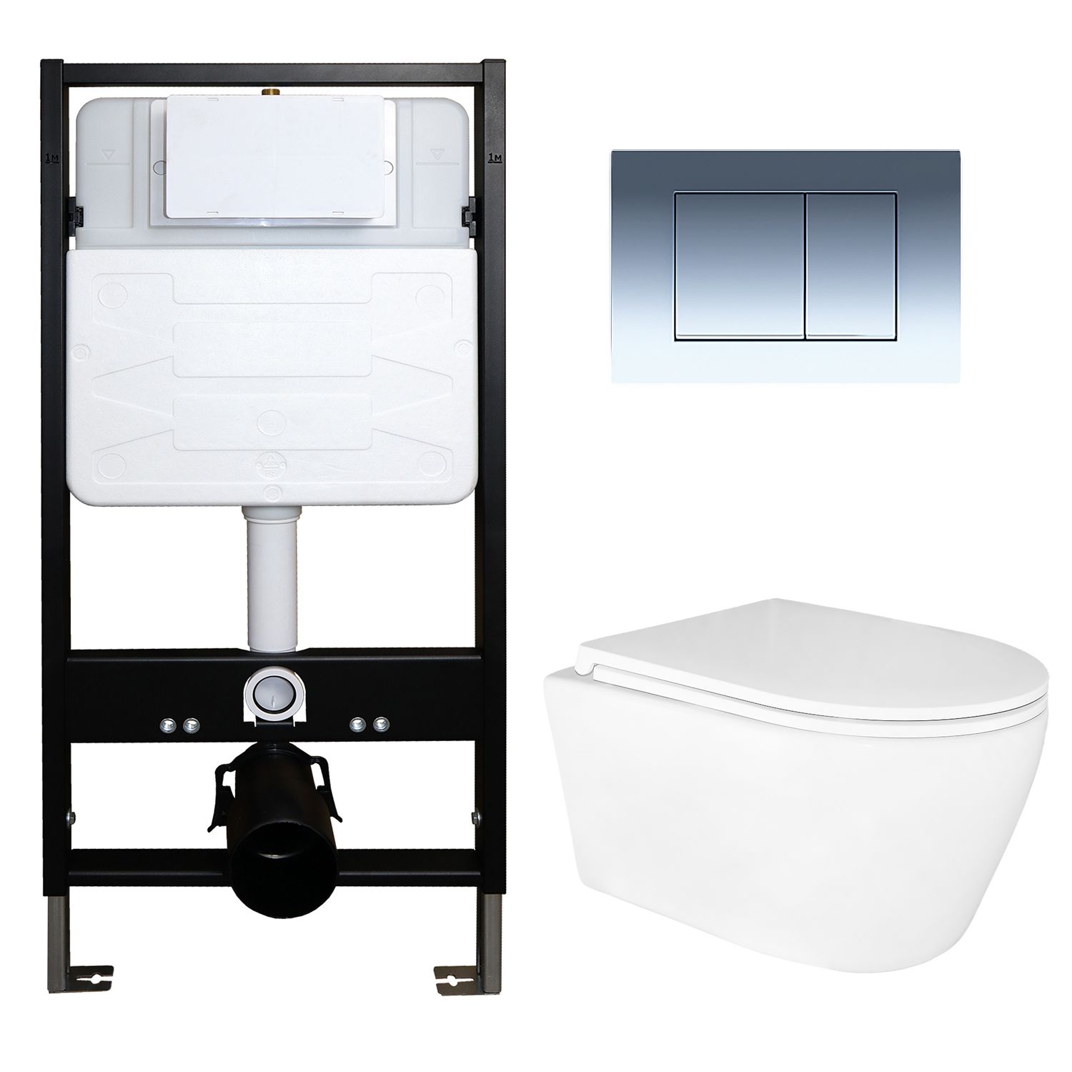 —Сет: Инсталляция для подвесного унитаза AZARIO FORTE + подвесной унитаз Azario UNO ТОРНАДО безободковый, слив "Скрытое Торнадо" + Кнопка смыва AZARIO FORTE, хром глянцевый (AZ-100-100F+AZ-2380+AZ-100-020F)