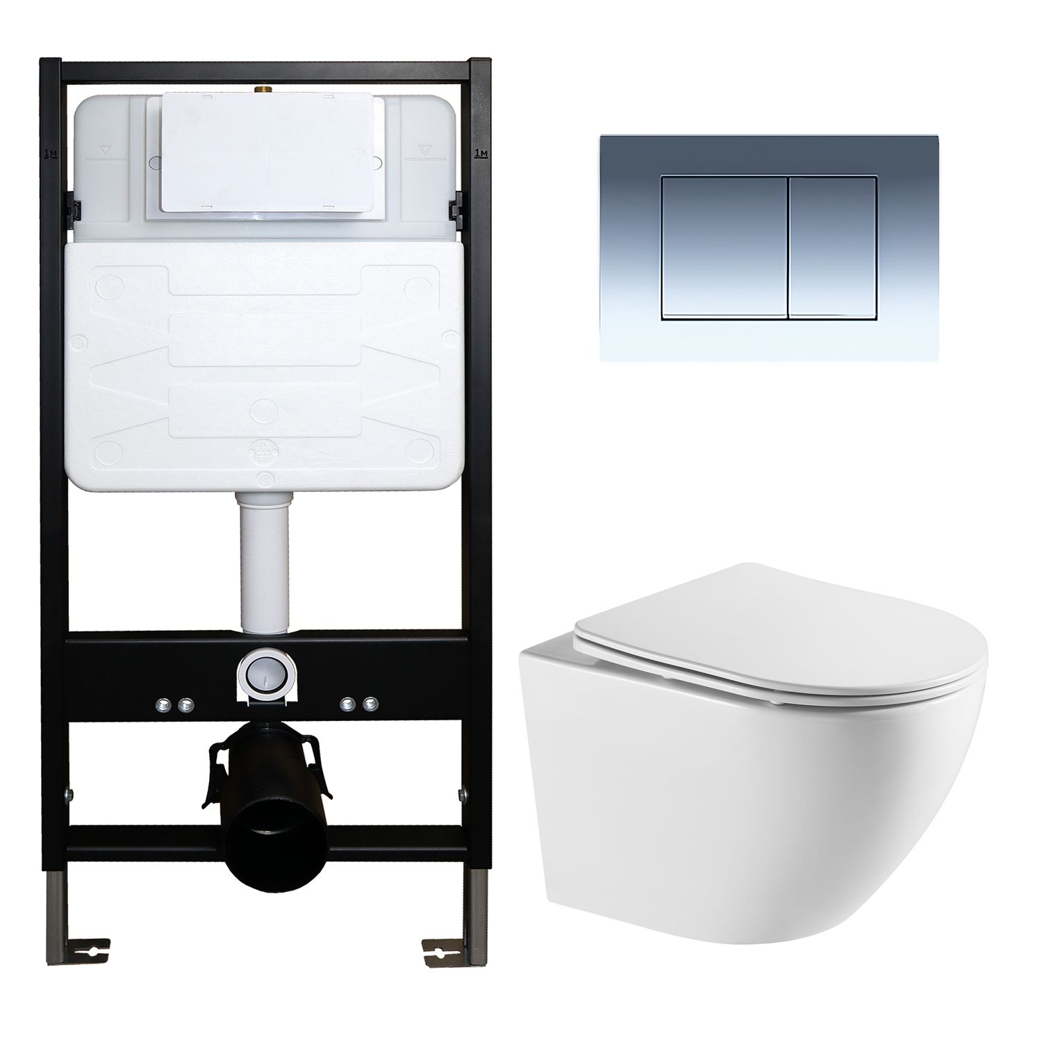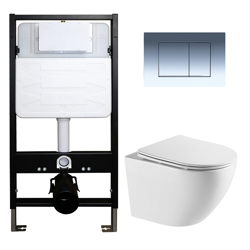—Сет: Инсталляция для подвесного унитаза AZARIO FORTE + подвесной унитаз Azario Grado безободковый, слив "скрытое Торнадо + Кнопка смыва AZARIO FORTE хром глянцевый (AZ-100-100F+AZ-0046-UQ3+AZ-100-002F)