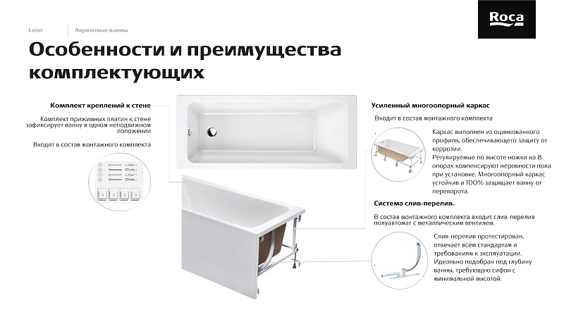 —Монтажный комплект для акриловой ванны Roca Leon 1500x700 мм (каркас, комплект креплений к стене, система слив-перелив)