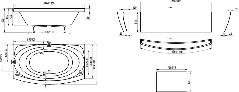 аксессуары: передняя и боковая панели, сточный комплект для ванны, подголовник