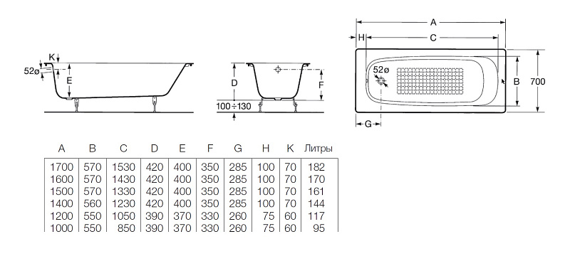 —Ванна чугунная Roca CONTINENTAL 170х70 пристенная (7.2129.1.100.R)