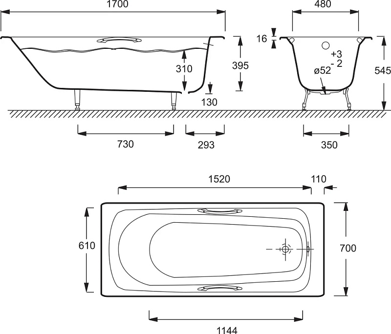 Ванна чугунная  Jacob Delafon MELANIE 170x70 см с антискользящим покрытием, с отверстием для ручек, без ножек, белая (E2925-00)