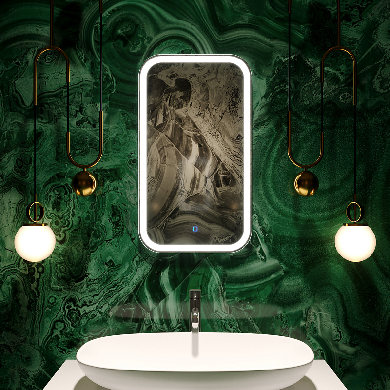 Особый характер этого зеркала с вертикальным расположением – в комбинации прямоугольной формы, мягкой геометрии и дизайна LED-подсветки. Световая рама расположена не по краям периметра, а несколько отступает от него. Графичность рисунка и всей формы смягчают скруглённые углы. Благодаря этой находке довольно минималистичный дизайн не мешает этому зеркалу быть яркой акцентной деталью любого пространства: от строгой, упорядоченной классики и сдержанного минимализма до свободолюбивых эклектичных интерьеров.