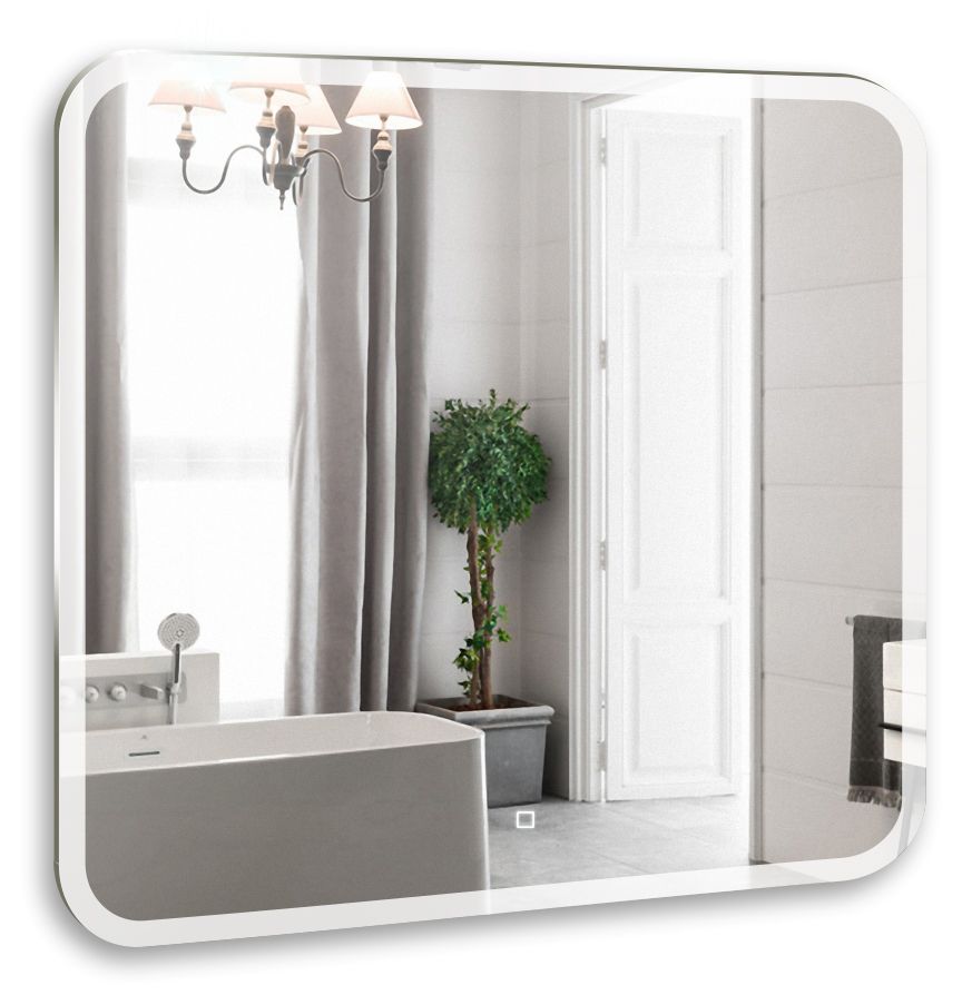 Зеркало оснащено сенсорным выключателем с функцией плавного диммирования с запоминанием последнего значения. Короткое касание светящейся области включает/выключает подсветку, длительное касание меняет яркость свечения.