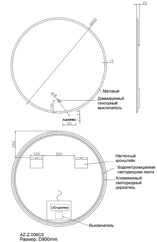 —Зеркало AZARIO Bris D900 с подсветкой, сенсорный выключатель с функцией диммера (AZ-Z-006CS)